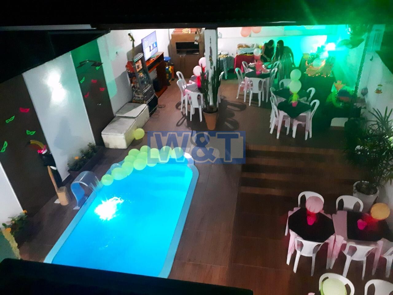 Área de lazer com piscina, ducha e varanda gourmet com churrasqueira.